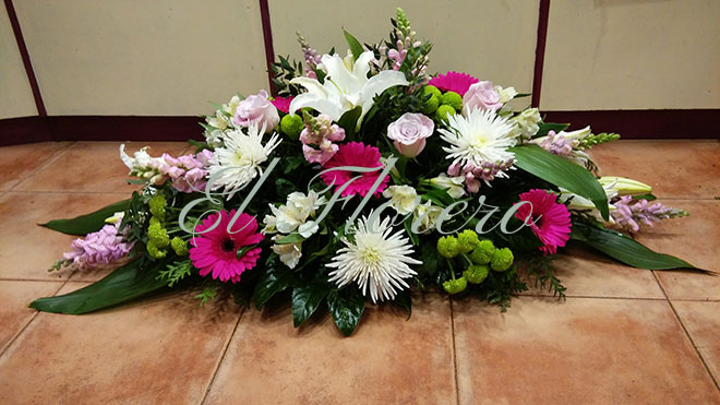 Centro ovalado delicado y discreto. Elaborado con varios tipos de flores