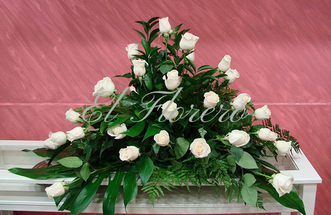 Un precioso centro funerario para decir adiós. 40 rosas blancas que transmitirán tus sentimientos. Puedes cambiarlas de color